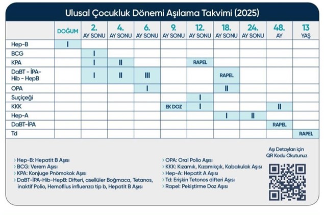 Ülkemizde ULUSAL AŞI TAKVİMİ TC. Sağlık Bakanlığı’nın önerileri ile uygulanmaktadır. Ulusal aşı takvimimiz çocukluk döneminde 13 hastalığa karşı rutin aşı uygulamasını içermektedir. Bunlar; Difteri, Boğmaca, Tetanos, Çocuk Felci, Hepatit B, Hepatit A, H. İnfluenza tip b, Tüberküloz, Kızamık, Kabakulak, Kızamıkçık, Suçiçeği ve Pnömokoktur.