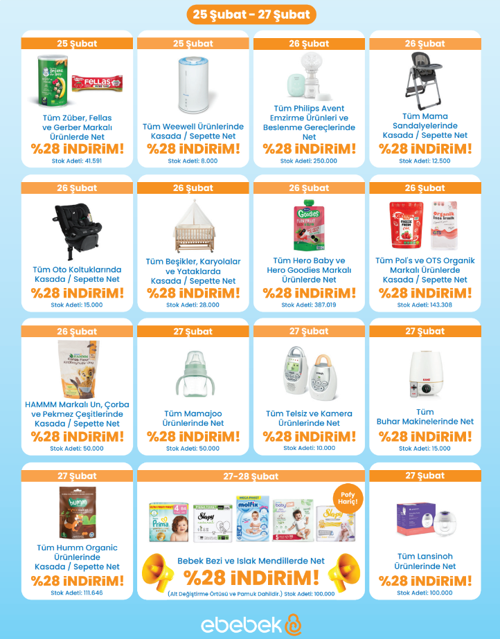 Şubat ayı boyunca her gün farklı marka ve ürünlerdeki indirim fırsatı ebebek.com ve mağazalarda geçerli.