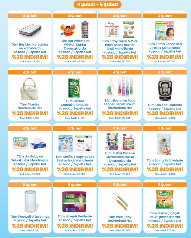 Peki bu indirimde neler olacak? Bebek bezinden oyuncağa, oto koltuğundan tekstil ürünlerine, bebek arabasından biberona kadar her gün farklı marka ve kategorilerde bebeveynlerin beğenisine çıkacak.